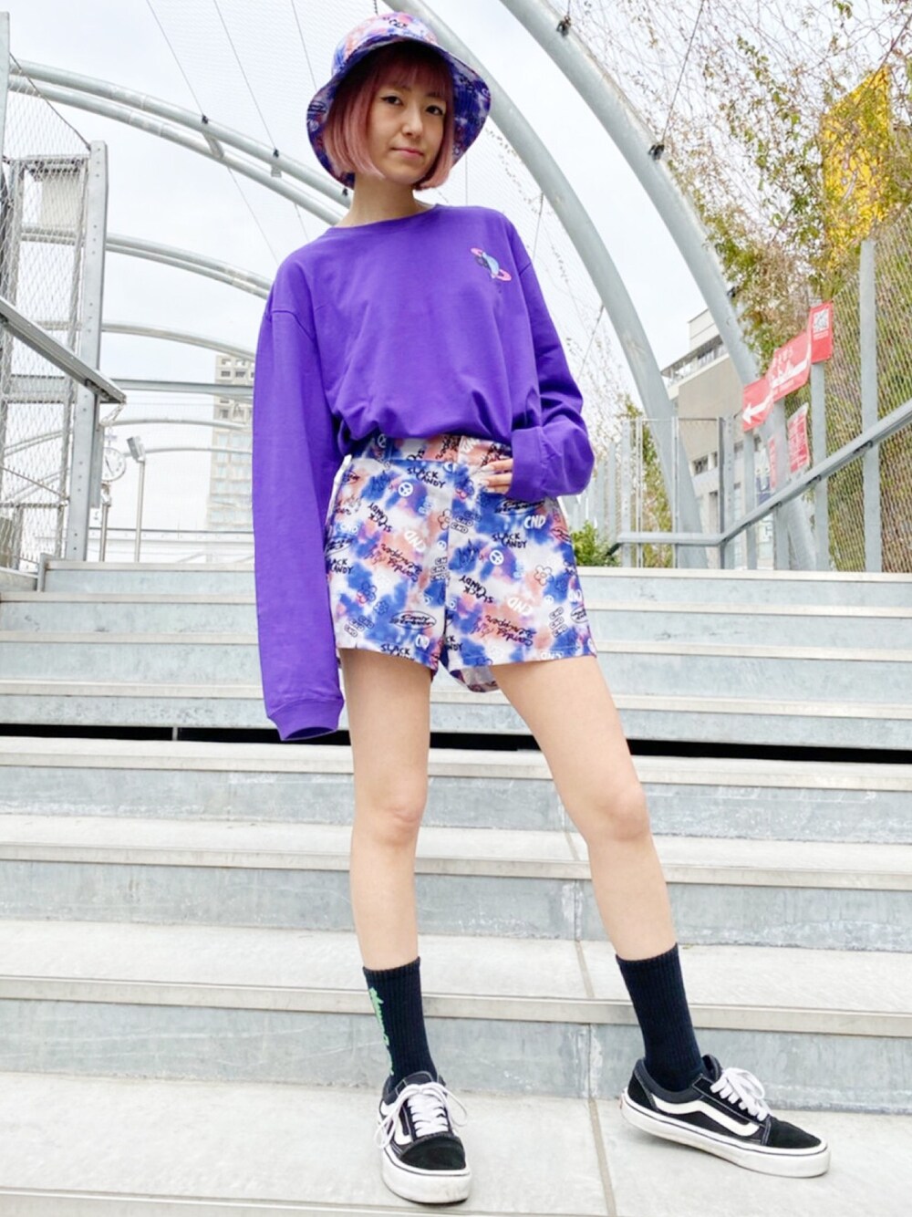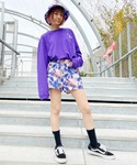 春のストリートコーデに! 70'sMOODなモチーフのタイダイ柄ショートパンツとバケットハットを合わせてお洒落ストリートに◎
