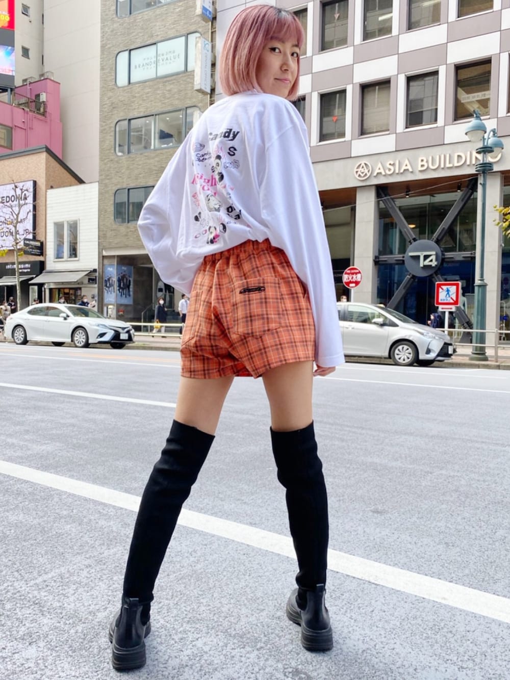 バックプリントが可愛いロンTに コンパクトな丈感がスタイルUPに見えるチェック柄のショートパンツを合わせたガーリーカジュアルコーデ♡