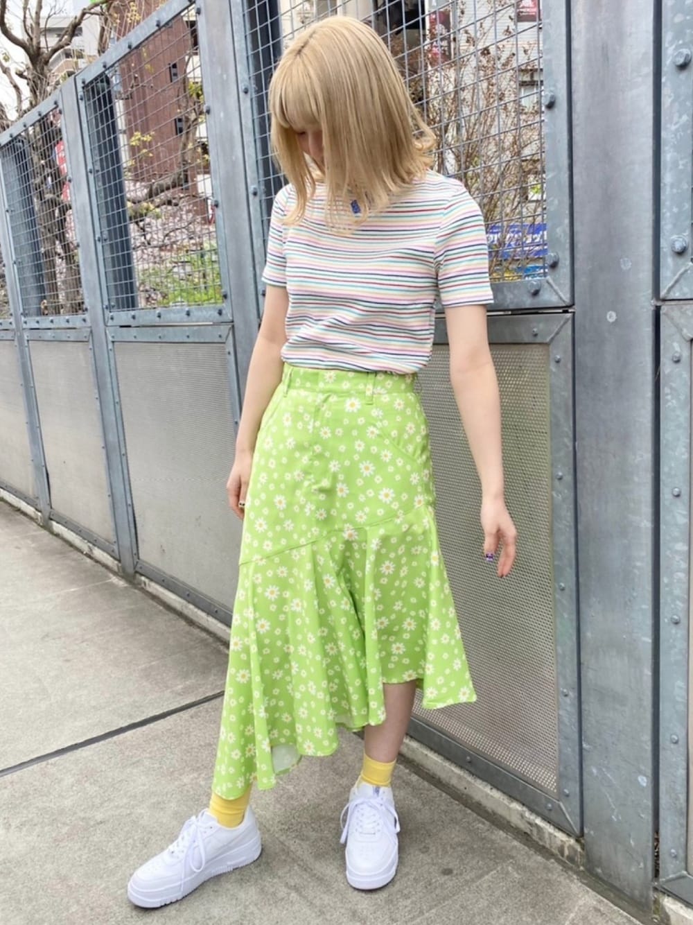 かわいいデイジー柄のフレアスカートにマルチボーダーがポイントのTOPSを合わせたガーリーストリートコーデ◎