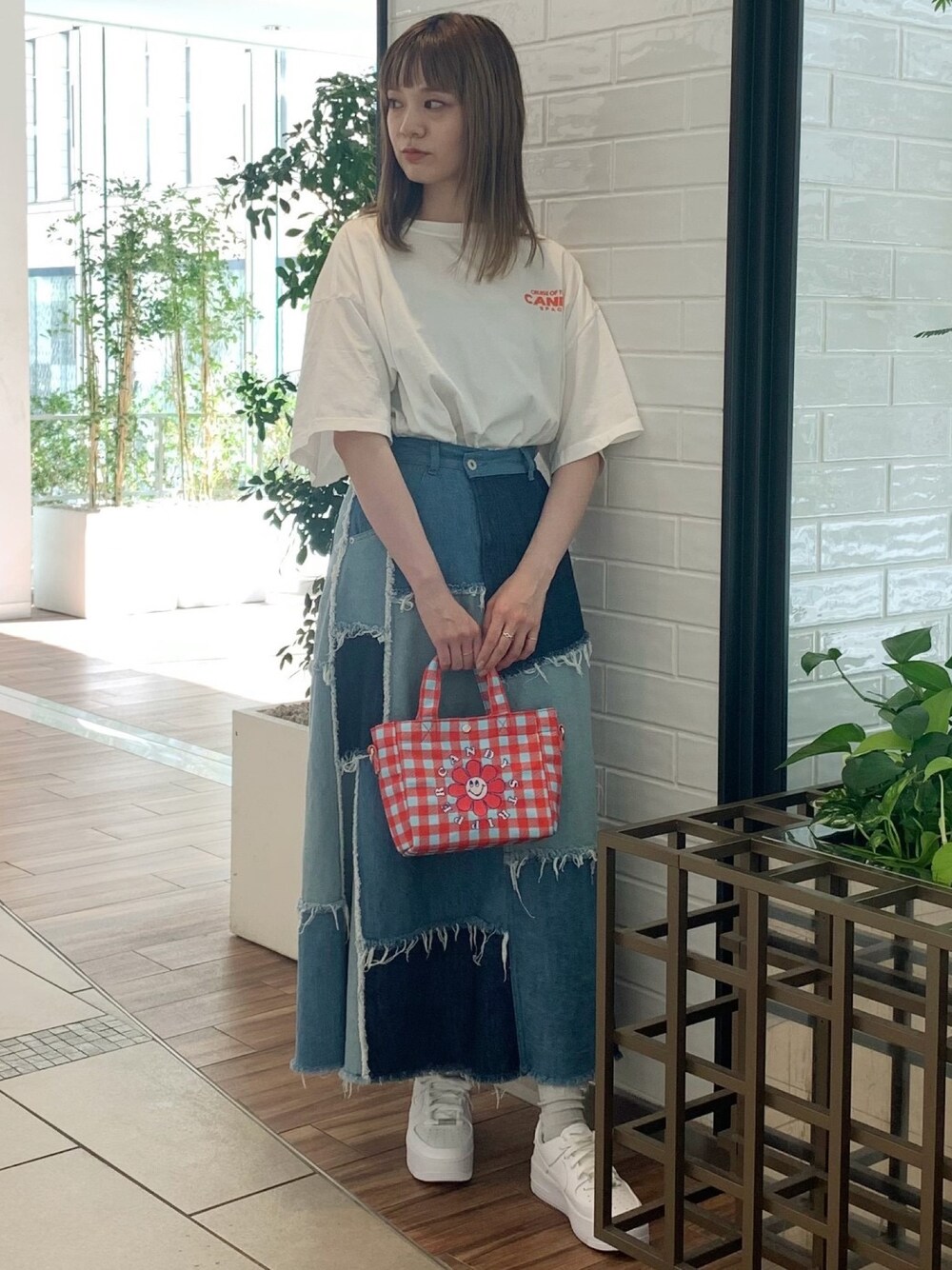 バックプリントがポイントのTシャツにリメイク風のデニムロングスカートを合わせた、大人ストリートスタイル◎