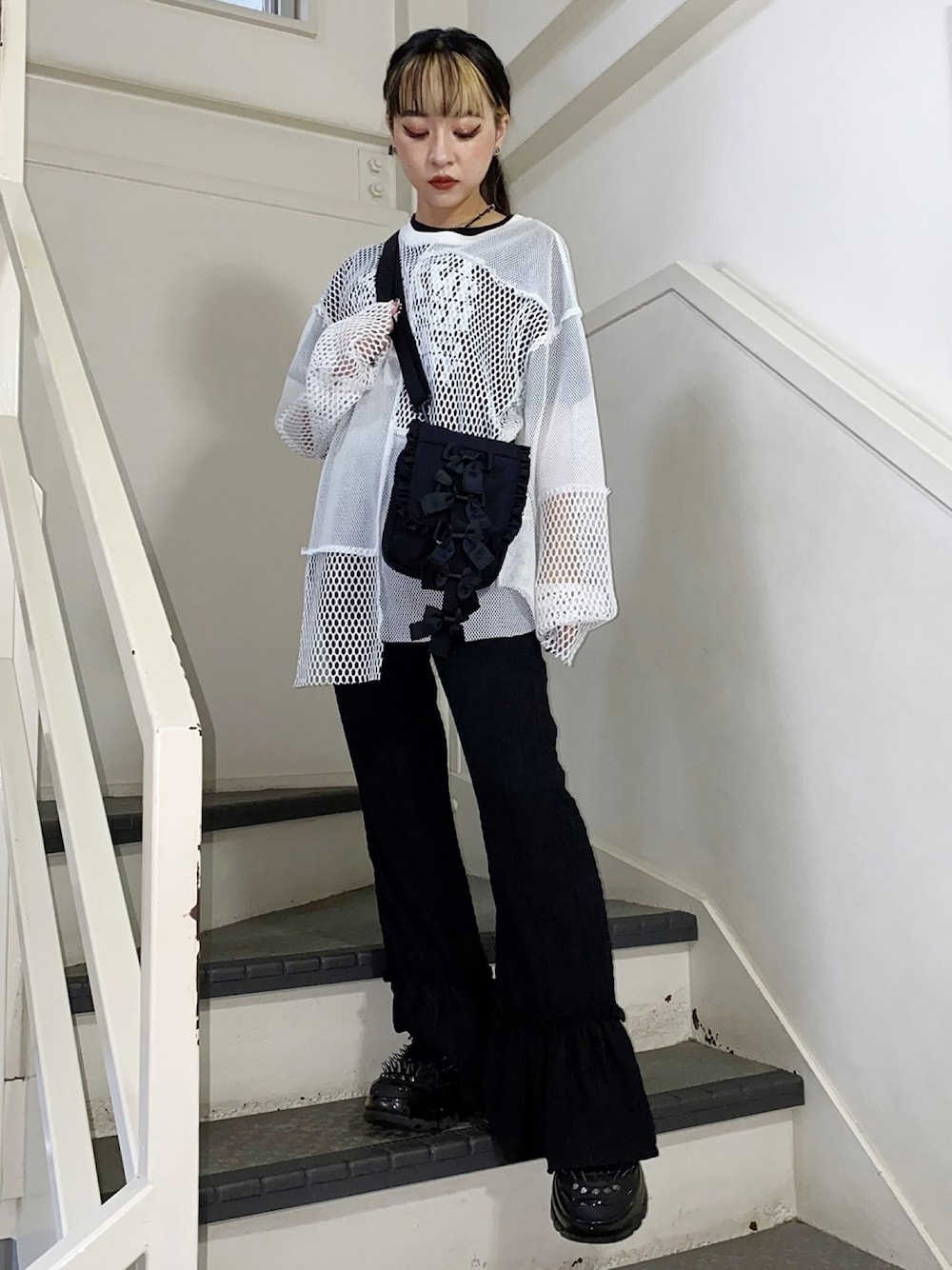 重ね着にぴったりなメッシュトップスを差し色ポイントに!そのほか黒でまとめたモノトーンコーデ♡ 秋に向けてのおしゃれなスタイリング◎