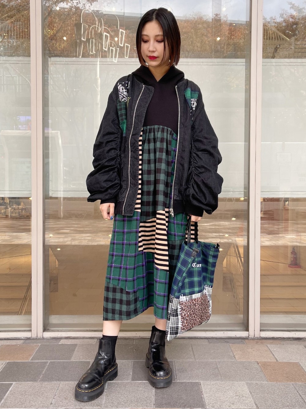 チェック柄に恋してる♡ チェックのパッチワークが可愛いMA-1にフード付きのチェックワンピースを合わせた、古着MIX風スタイル♪