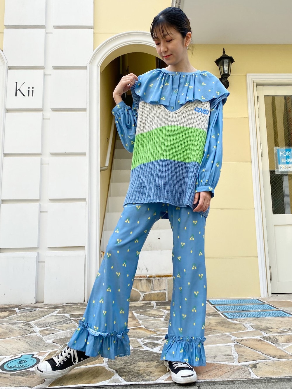 チューリップ柄のガーリーな セットアップにニットベストを合わせた ガーリーカジュアルスタイル♡