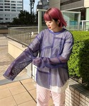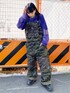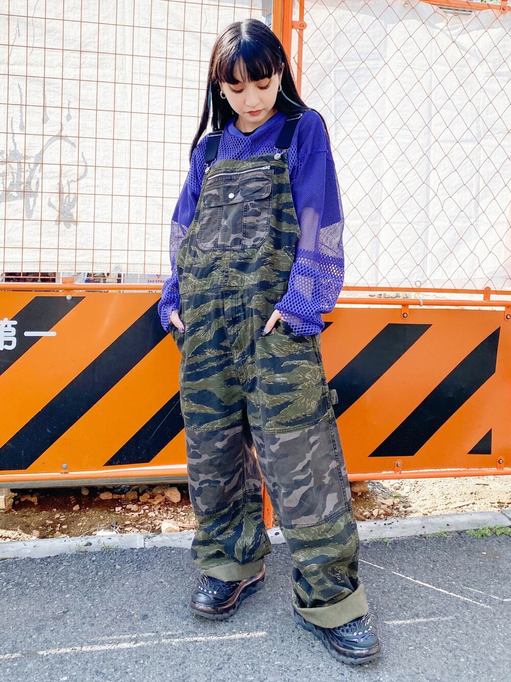 カモフラージュ柄のサロペットに パープルのメッシュトップスを合わせた ストリートコーデ☆