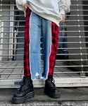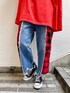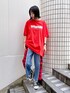 ビタミンカラーのTシャツに リメイク風のデザインのデニムパンツを 合わせたカジュアルコーデ♪