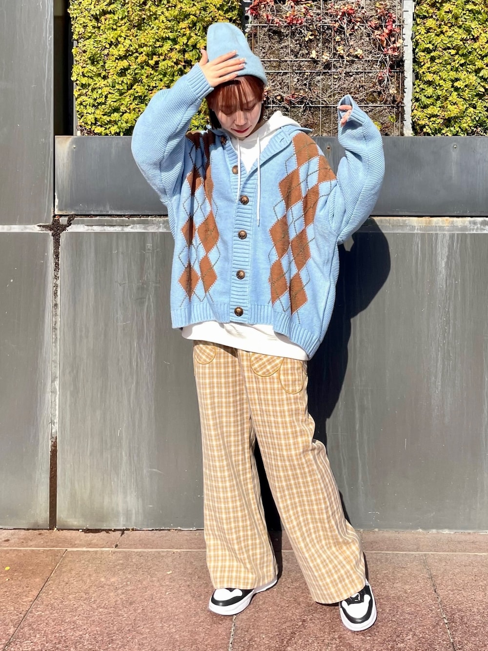 アーガイルのニットカーディガンに チェック柄のパンツを合わせた カラーコーデ♡ candystripper福岡店/河野/160cm