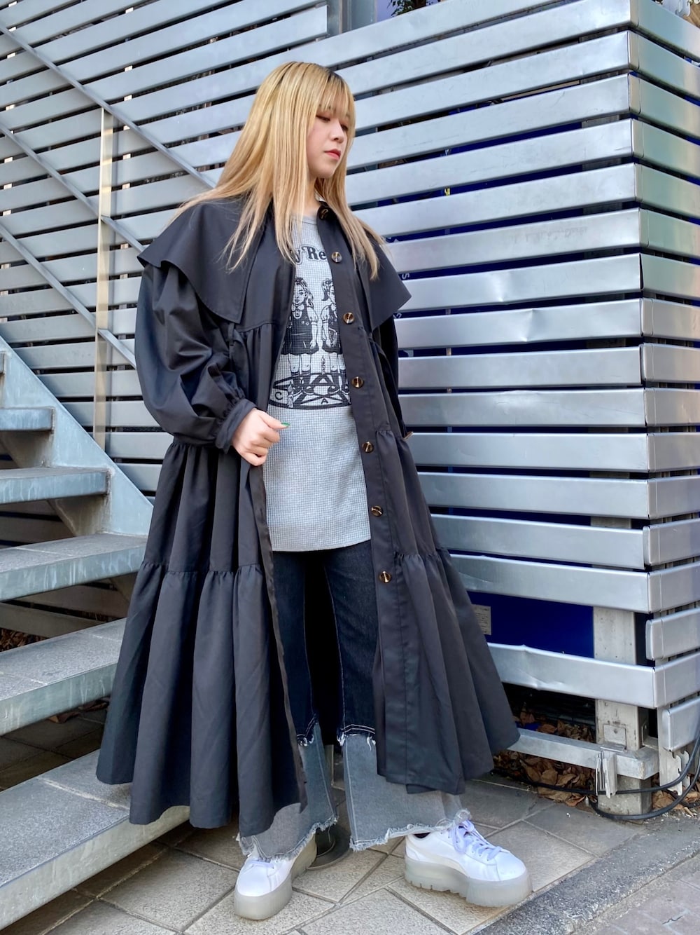 ワッフル生地のロンTにデニムパンツと トレンチコートを合わせた 春のカジュアルスタイル♪ candystripper原宿/石本/160cm