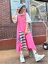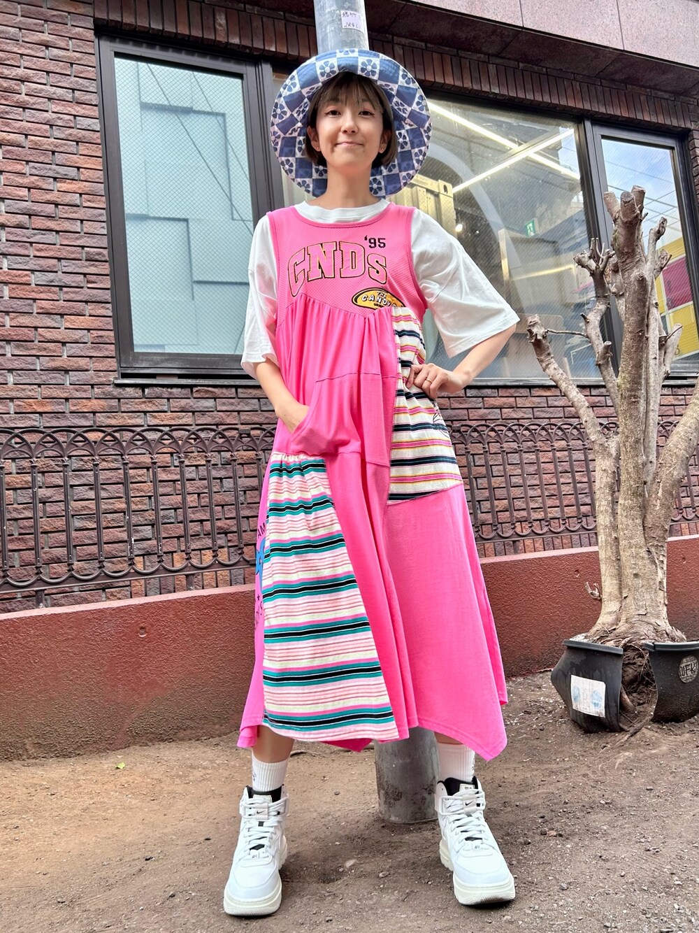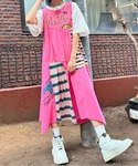 ピンクのリメイク風タンクワンピースに Tシャツとバケットハットを合わせた カラーコーデ♪ candystripper本社/小原/162cm