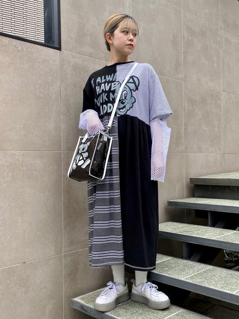 メッシュトップスにTシャツワンピースと ショルダーバッグを合わせた カジュアルコーデ★ candy stripper原宿店/石本/160cm