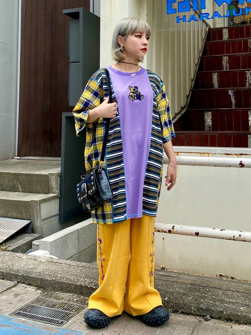 リメイク風のトップスに トラックパンツを合わせた ストリートコーデ♪ candy stripper原宿店/久慈/148cm