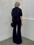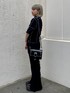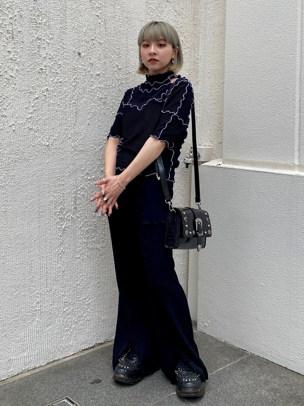 デザイントップスにフレアパンツと ショルダーバッグを合わせた ブラックコーデ★ candy stripper原宿店/久慈/148cm