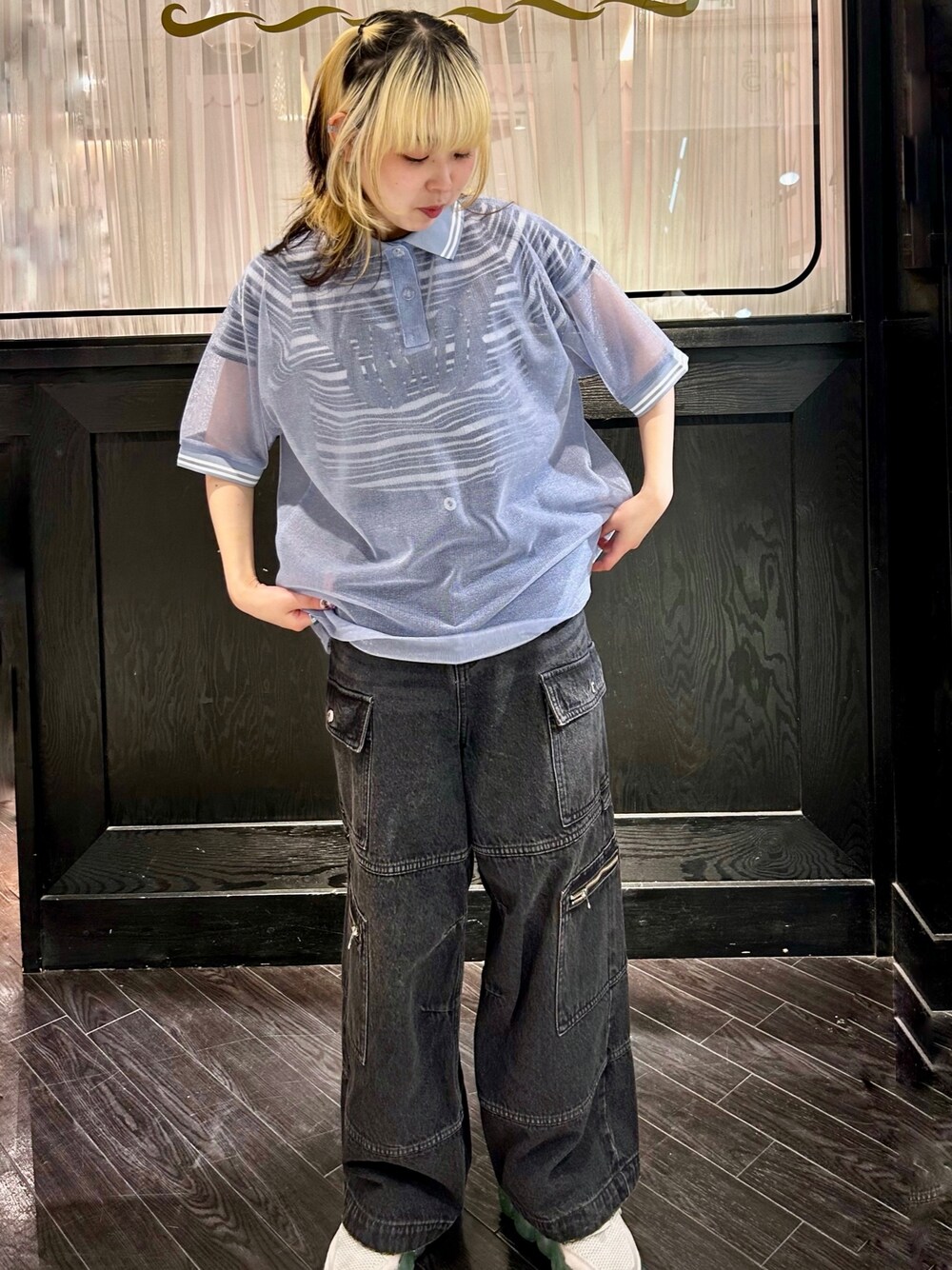 コンパクトトップスにシアートップスと カーゴパンツを合わせた レイヤードスタイル♪ candy stripper名古屋店/太田/156cm