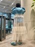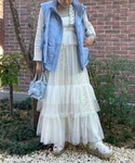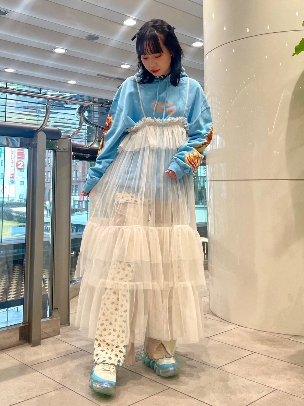 ライトブルーのフーディーに キャミソールワンピとパッチワークパンツを合わせたガーリーコーデ♡ candy stripper福岡店/河野/160cm