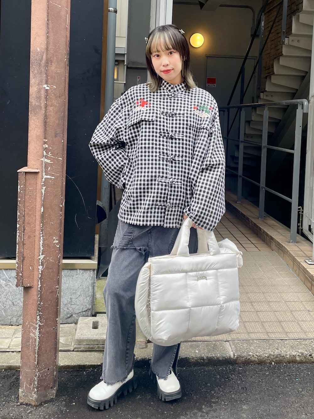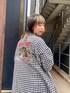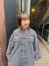 チェックのチャイナジャケットに デニムのレイヤードパンツを合わせた ストリートコーデ♪ candy stripper福岡店/河野/160cm