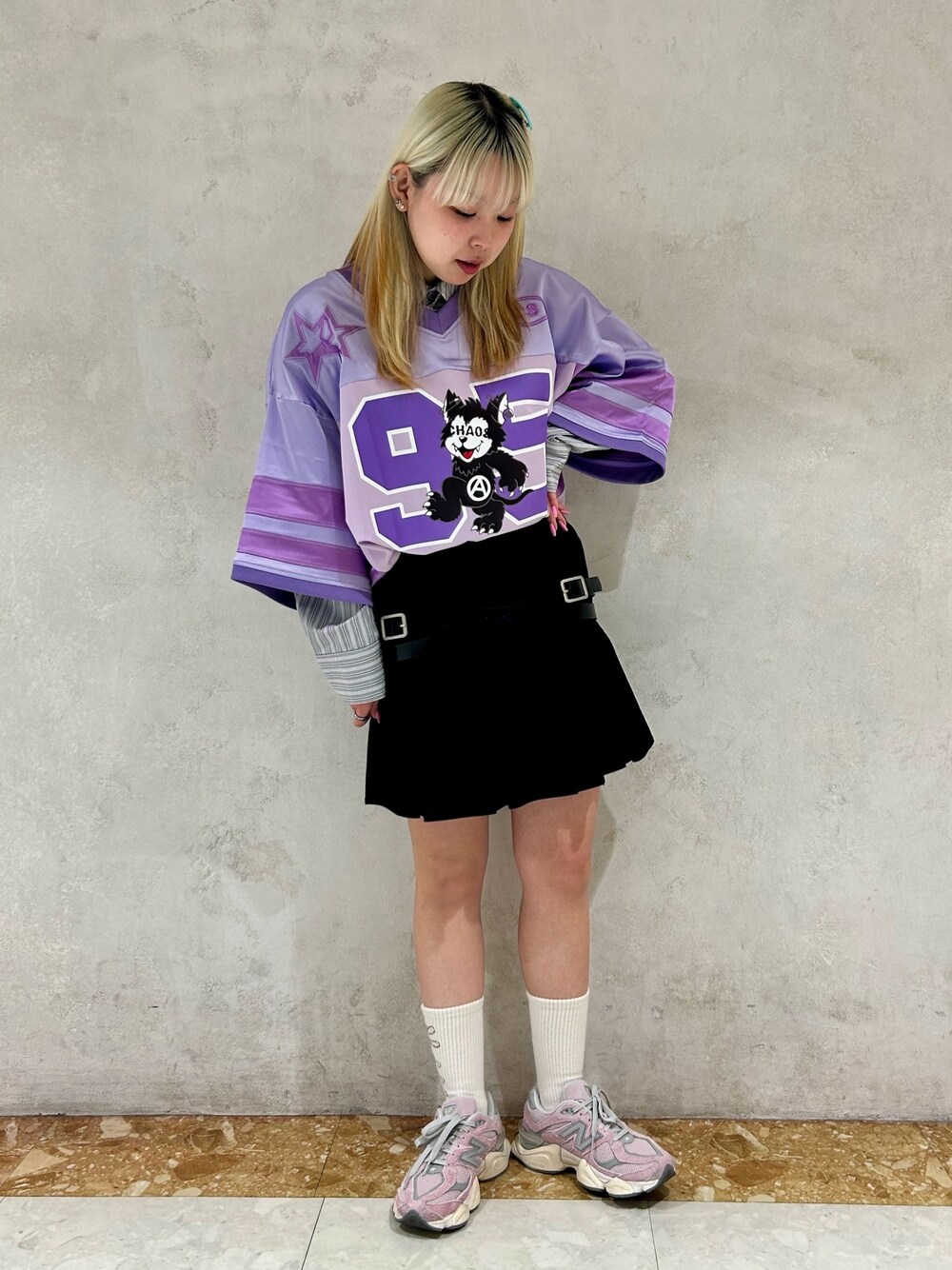 ストライプのシャツに ナンバリングトップスと プリーツスカートを合わせた ストリートコーデ★ candy stripper名古屋店/太田/156cm