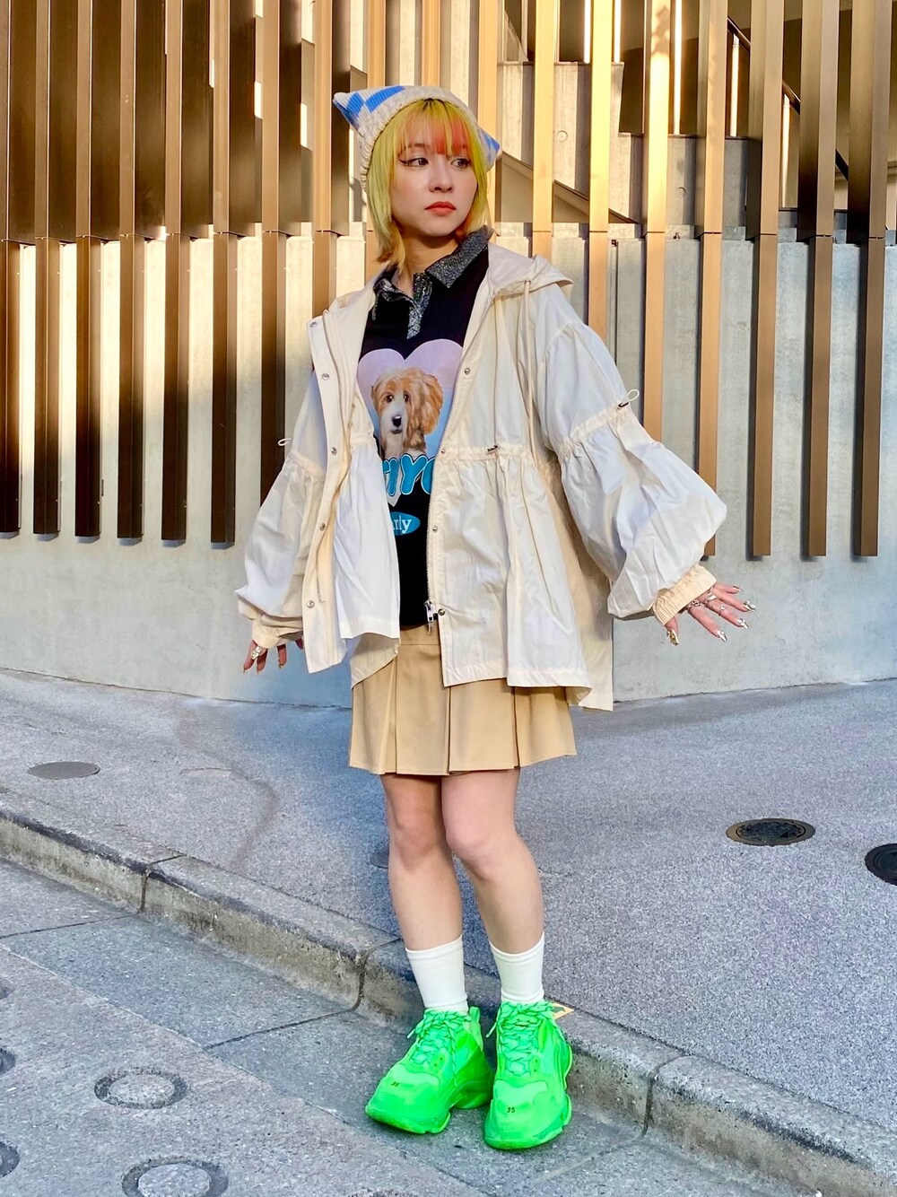 ポロトップスにナイロンジャケットと ミニスカートを合わせた ストリートコーデ★ candy stripper原宿店/久慈/148cm