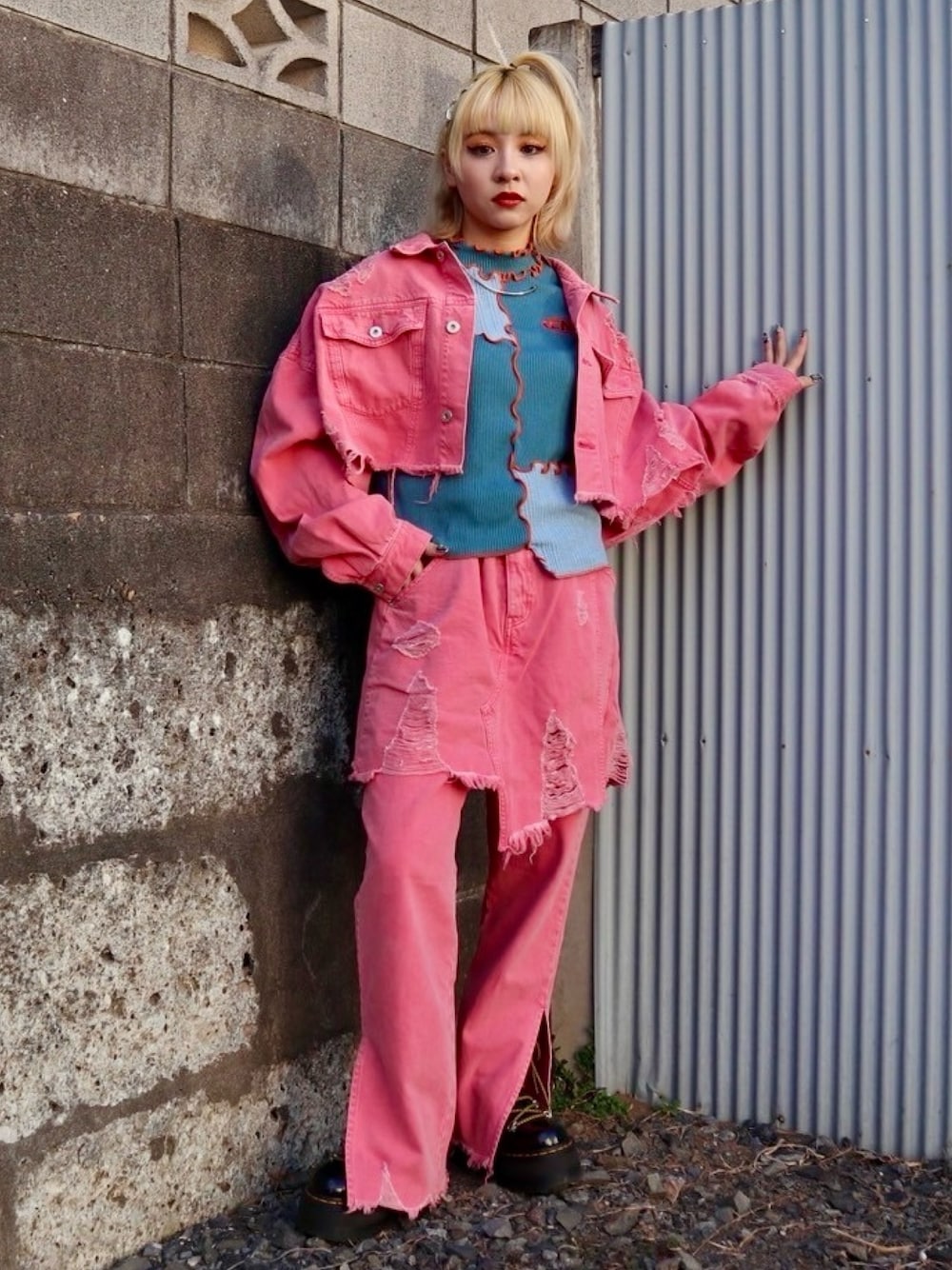 ピンクのショート丈のジャケットと レイヤードパンツのセットアップに タートルトップスを合わせた 春コーデ♡ candy stripper原宿店/久慈/148cm