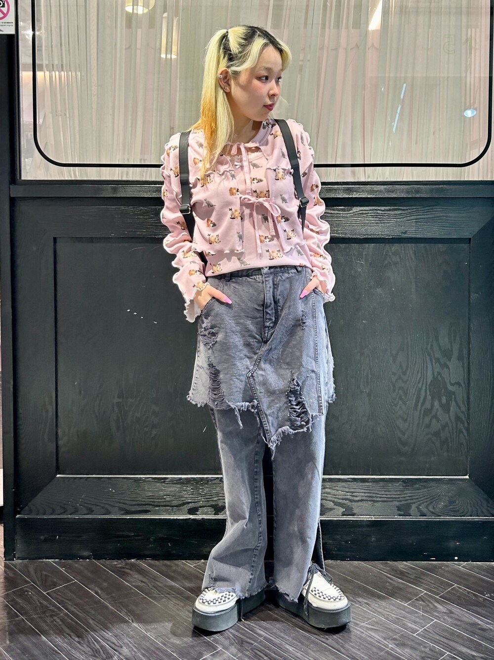 BABY KITTENS柄のカーディガンと キャミソールに レイヤードパンツを合わせた ガーリーコーデ♡ candy stripper名古屋店/太田/156cm