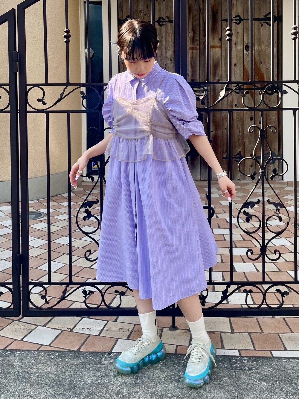 チュールビスチェを重ねた レイヤードデザインのシャツワンピースに スニーカーを合わせたガーリーコーデ♡ candy stripper福岡店/河野/160cm