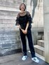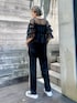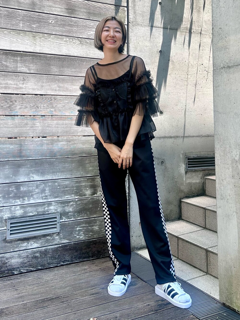 チュールトップスにビスチェと イージーパンツを合わせた カジュアルコーデ♪ candy stripper本社/小原/162cm