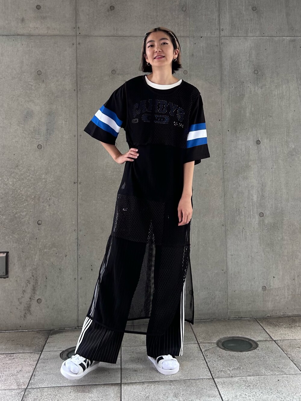 リンガーTシャツにストライプのパンツと メッシュワンピースを合わせた レイヤードスタイル♪ candy stripper本社/小原/162cm