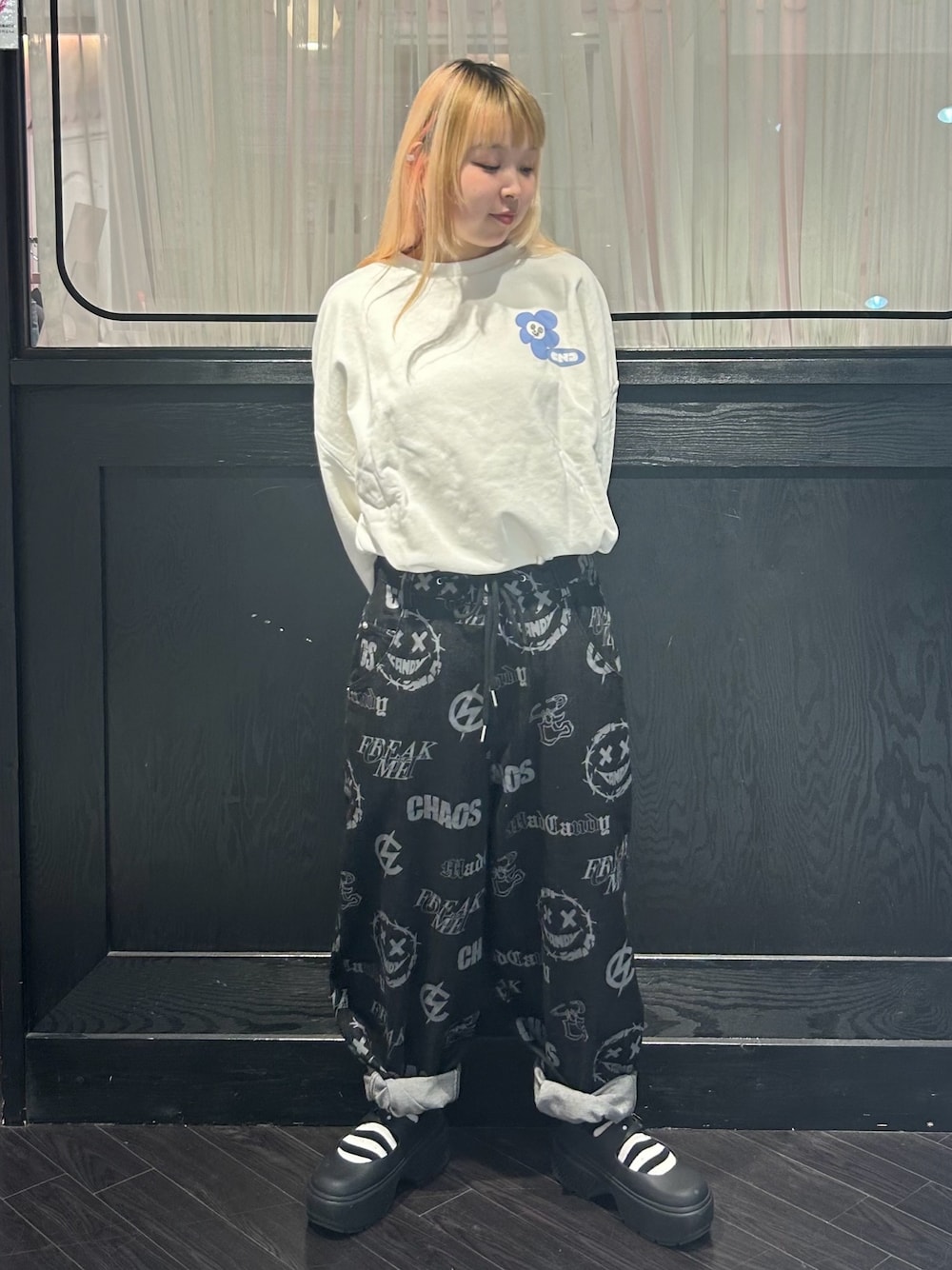 スウェットにスマイルの総柄をラバープリントしたデニムパンツを合わせた カジュアルコーデ★ Candy Stripper名古屋店/太田/156cm