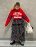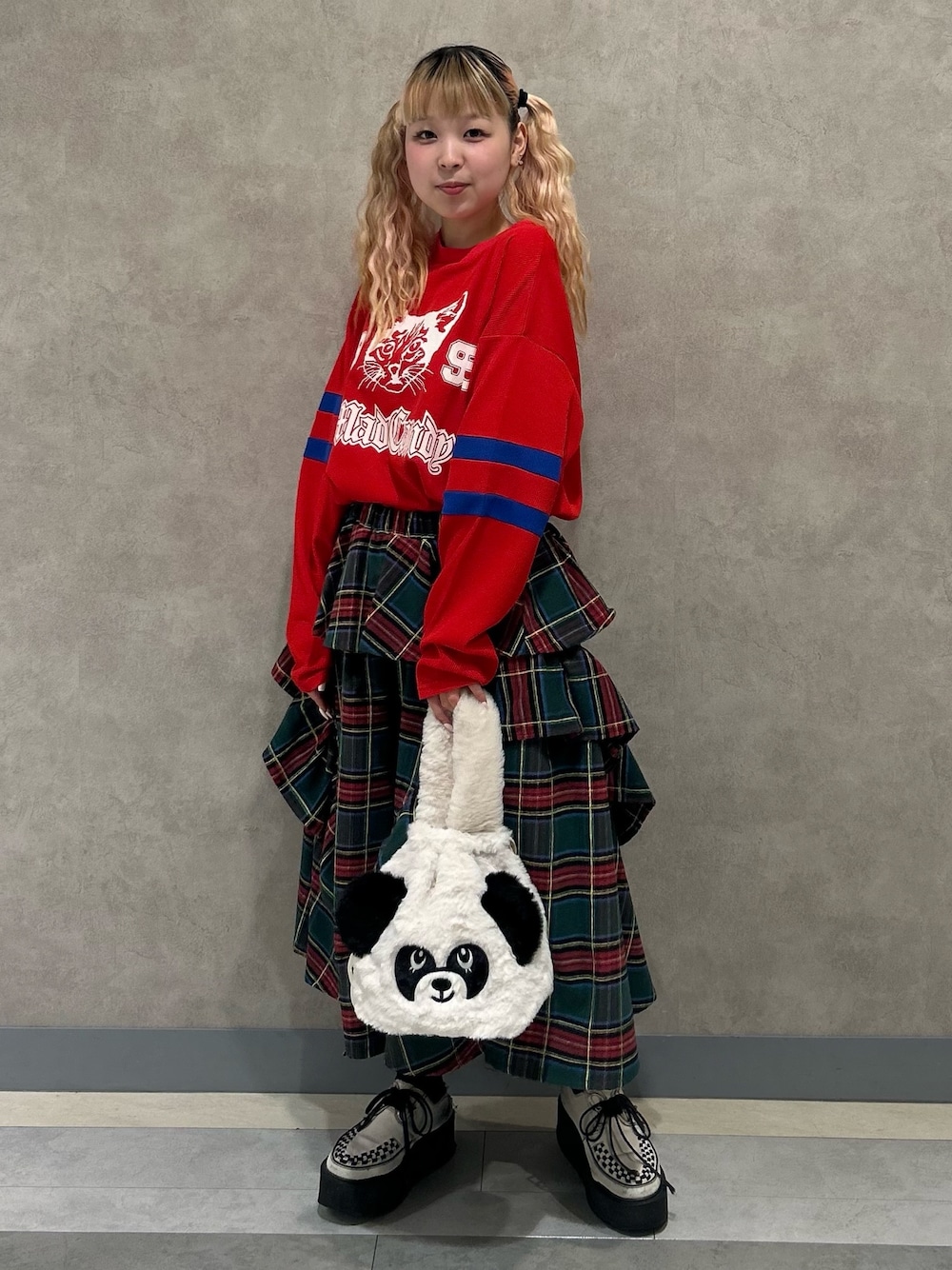 ワッフルトップスにミドル丈のタータンチェックのスカートとPEPEのハンドバッグを合わせたカジュアルコーデ♪ Candy Stripper名古屋店/太田/156cm