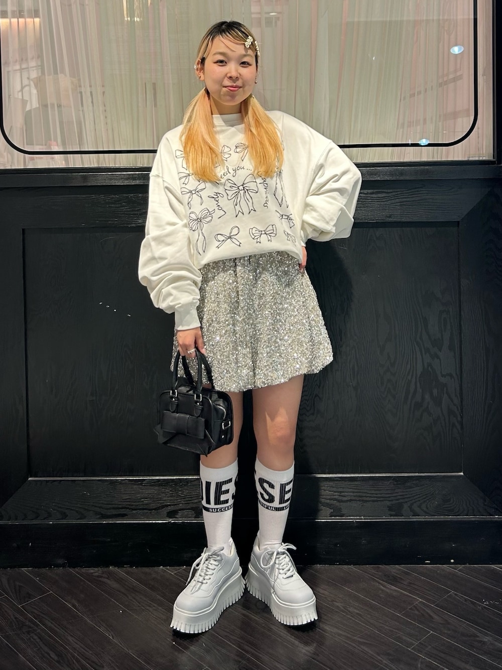 フレンチガーリーなリボンモチーフが キュートなスウェットに バルーンシルエットのショートパンツを 合わせた冬コーデ♡ Candy Stripper名古屋店/太田/156cm