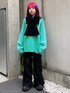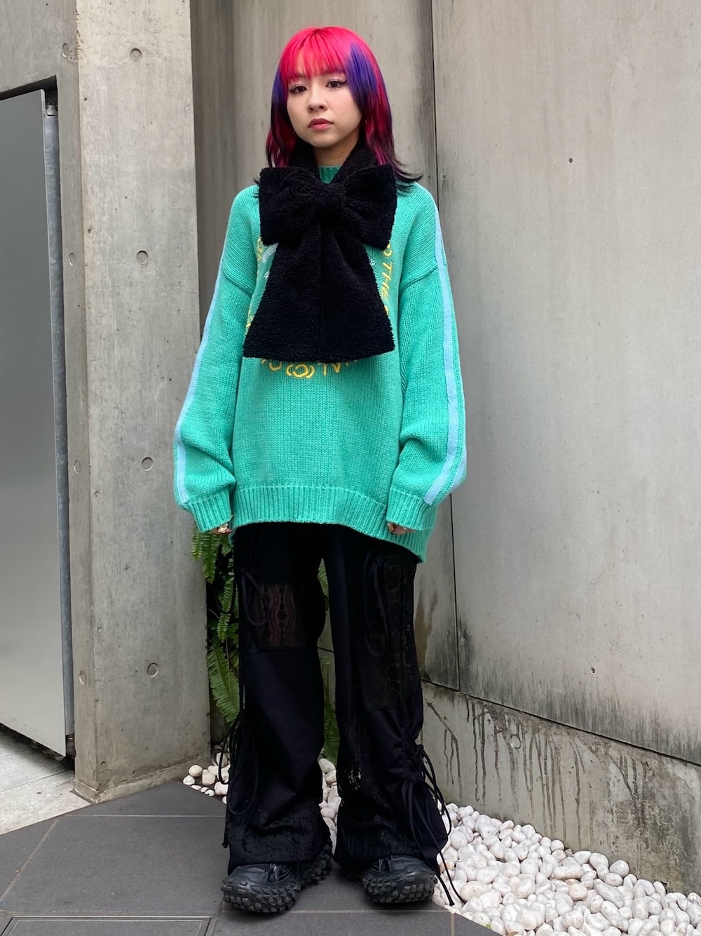 スマイルモチーフのニットトップスに イージーパンツとリボンマフラーを合わせたカジュアルコーデ♪ Candy Stripper原宿店/久慈/148cm