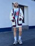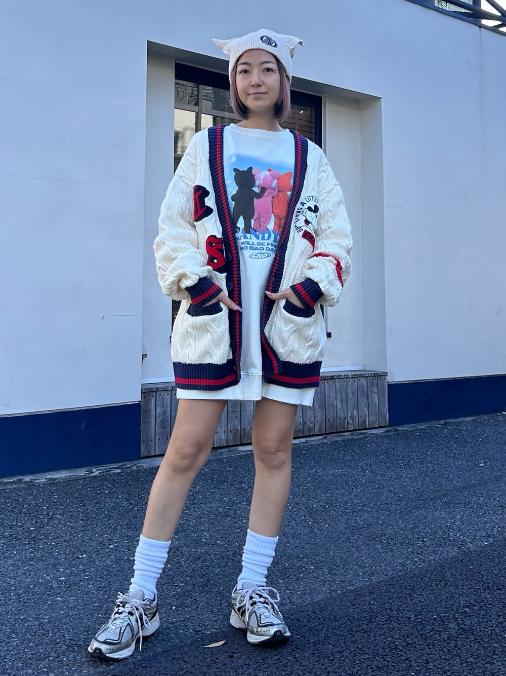 スウェットワンピースにカレッジテイストなVネックカーディガンとビーニーを 合わせたカジュアルコーデ★ Candy Stripper本社/小原/162cm