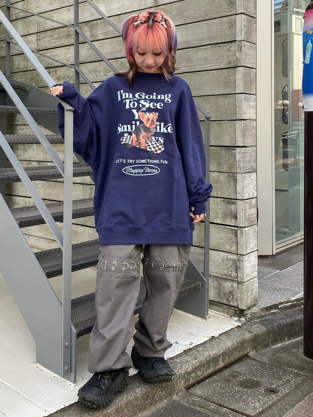 スウェットワンピースにリングディティールが目を惹くパンツを合わせた ストリートスタイル★ Candy Stripper原宿店/久慈/148cm