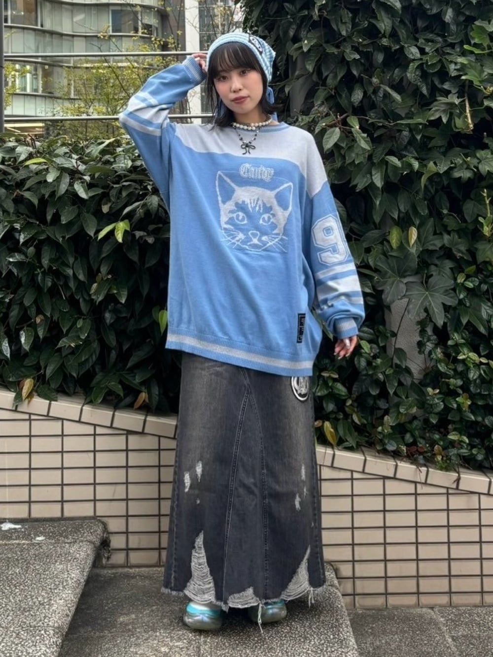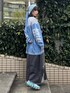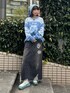 ナンバリンググラフィックのニットに デニムロングスカートとビーニーを合わせたお出かけコーデ♪ Candy Stripper福岡店/河野/160cm