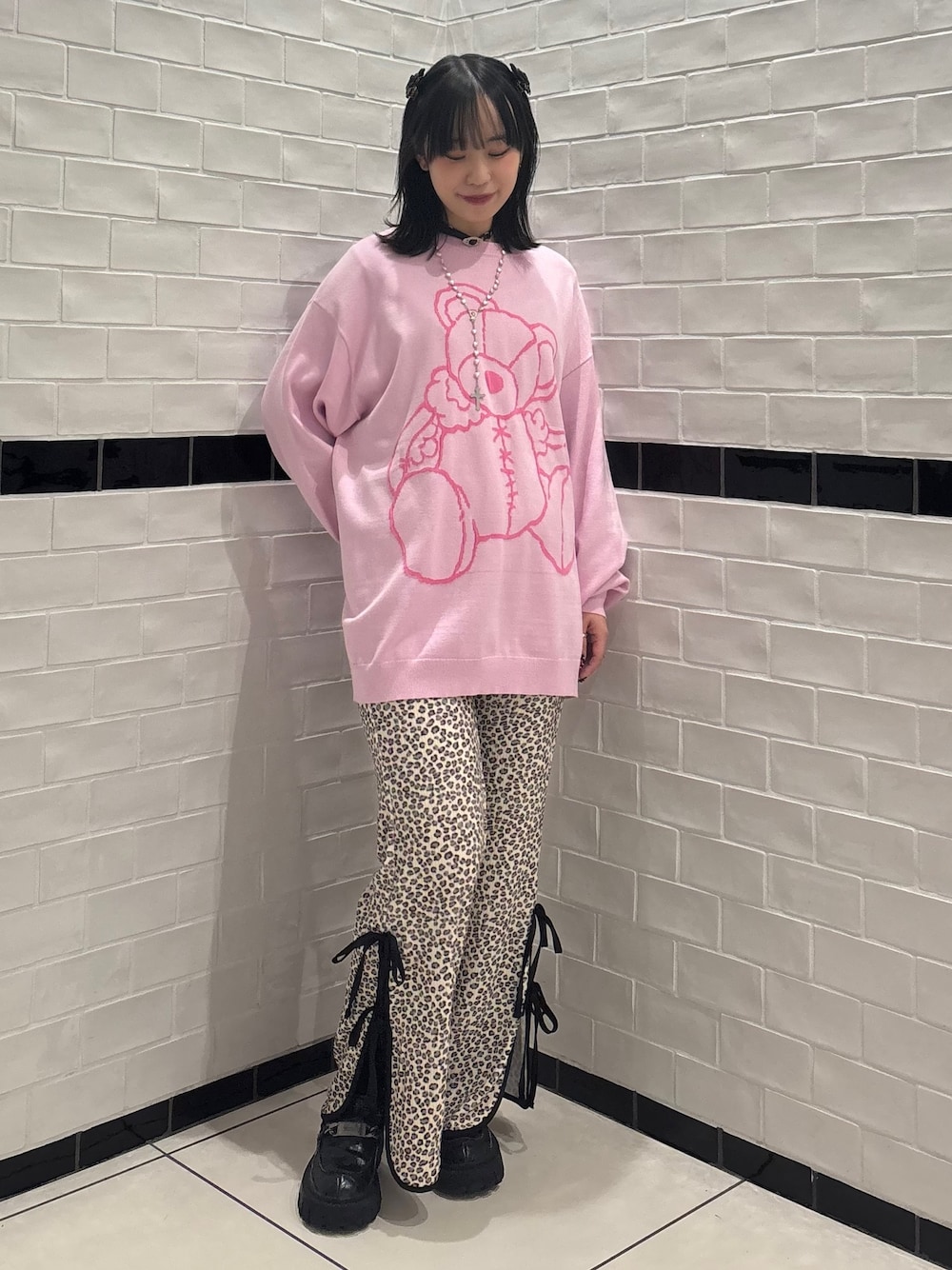 クマのぬいぐるみモチーフのニットに レオパードのフレアパンツを合わせた カジュアルコーデ♪ Candy Stripper福岡店/河野/160cm