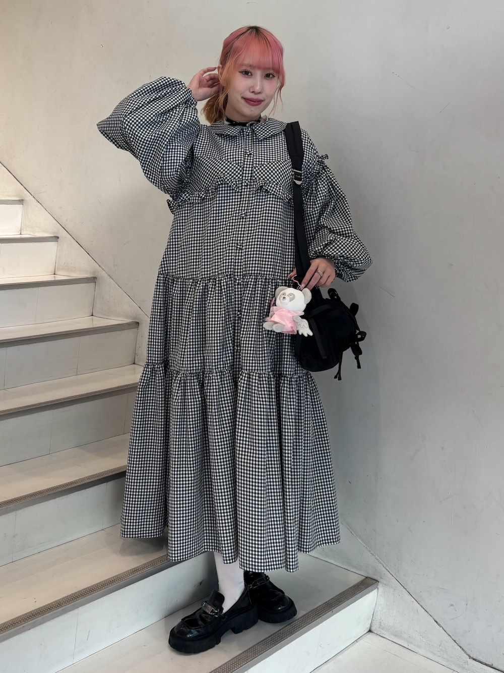 ギンガムチェックのロング丈のワンピースに ショルダーバッグを合わせた休日スタイル☆ Candy Stripper福岡店/河野/160cm