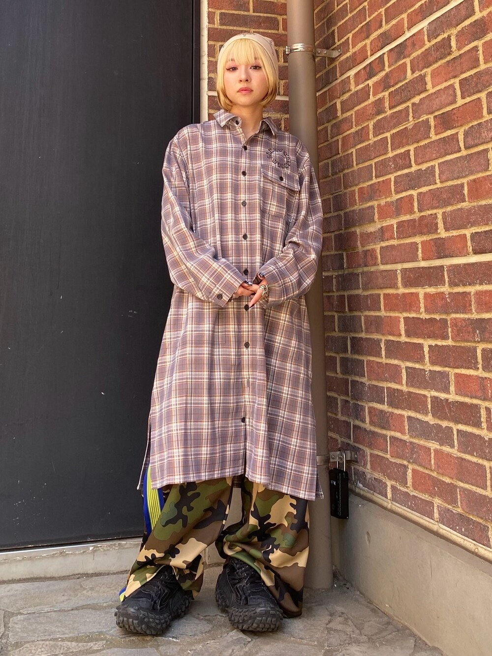 チェックのシャツワンピに カモフラージュ柄のトラックパンツとビーニーを合わせたストリートスタイル★ Candy Stripper原宿店/久慈/148cm