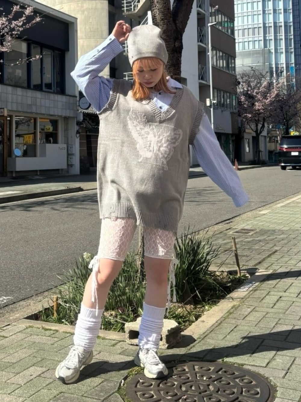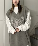 タトゥータッチのバタフライモチーフのニットベストにストライプシャツとバイカーショーツを合わせたスポーツミックスコーデ☆ Candy Stripper福岡店/河野/160cm