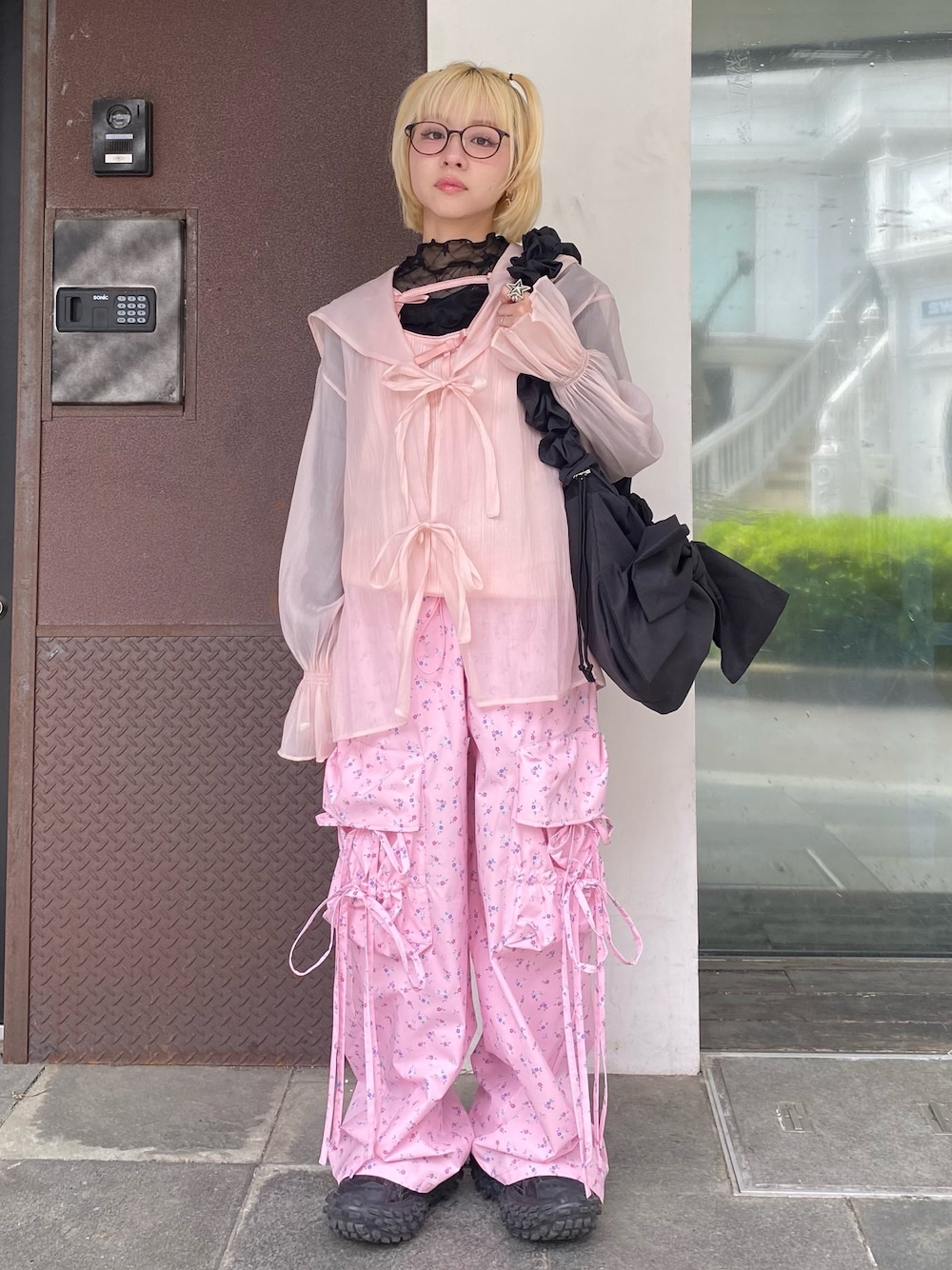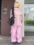 セーラーカラーのブラウスに 星柄のシースルートップスとキャミソールと 花柄のカーゴパンツを合わせた 春コーデ☆ Candy Stripper原宿店/久慈/148cm