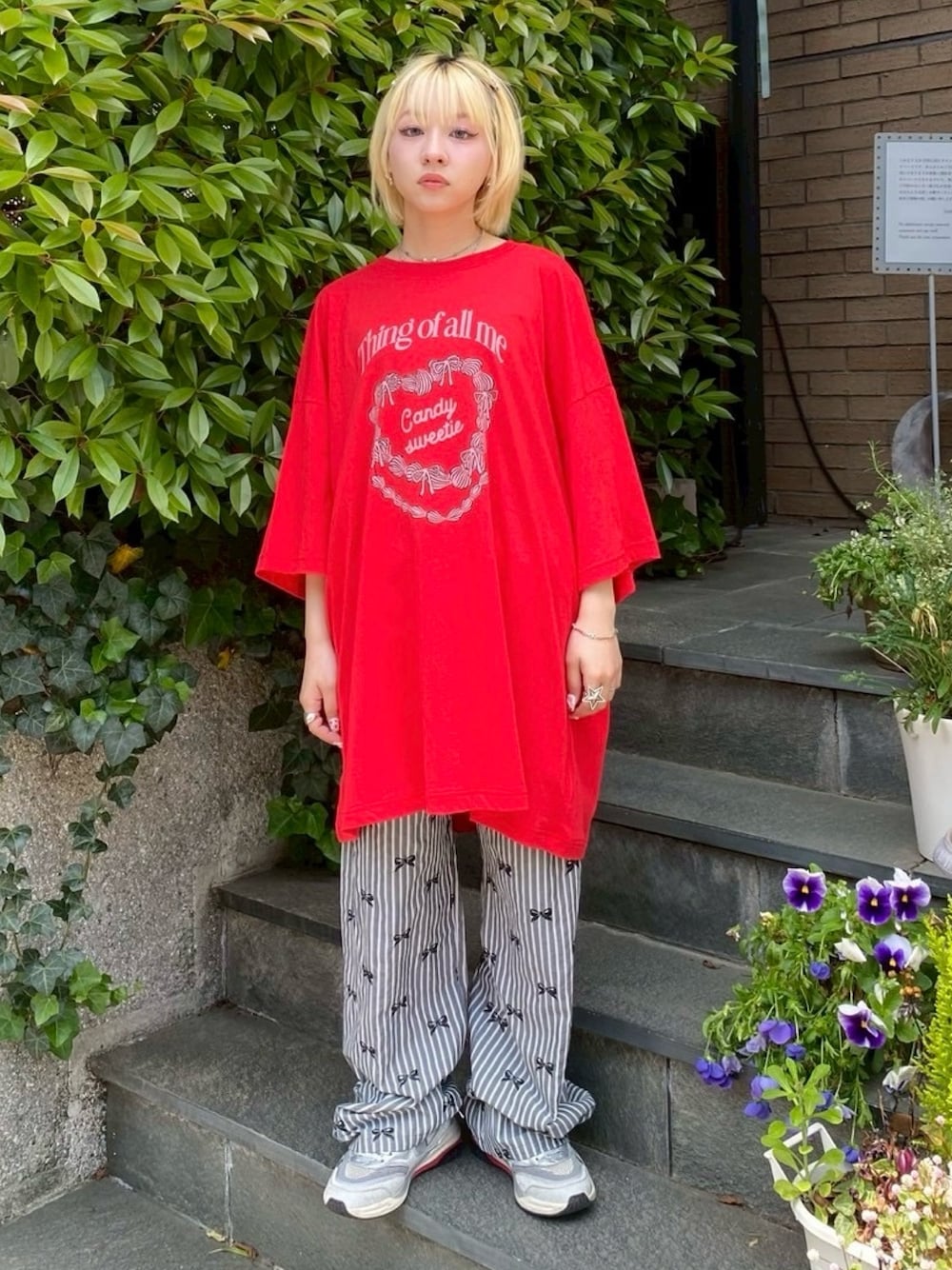 オーバーサイズのTシャツに ストライプ素材のイージーパンツを合わせた Tシャツコーデ⭐︎ Candy Stripper原宿店/久慈/148cm