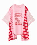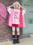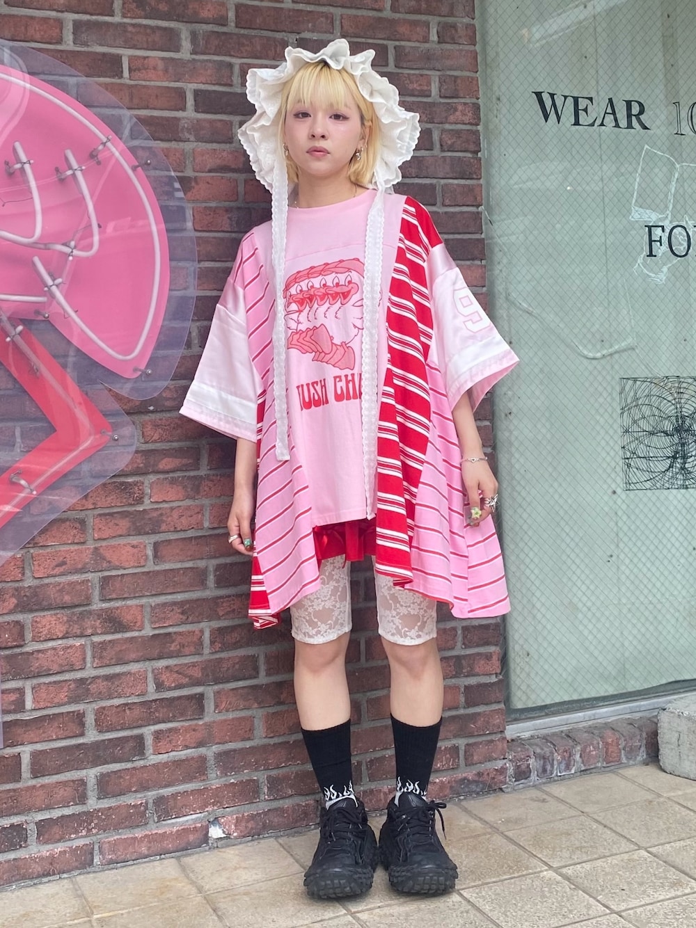 リメイク風のTシャツにミニスカートと バイカーショーツとフリルハットを合わせた スポーツミックスコーデ♡ Candy Stripper原宿店/久慈/148cm