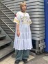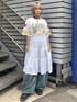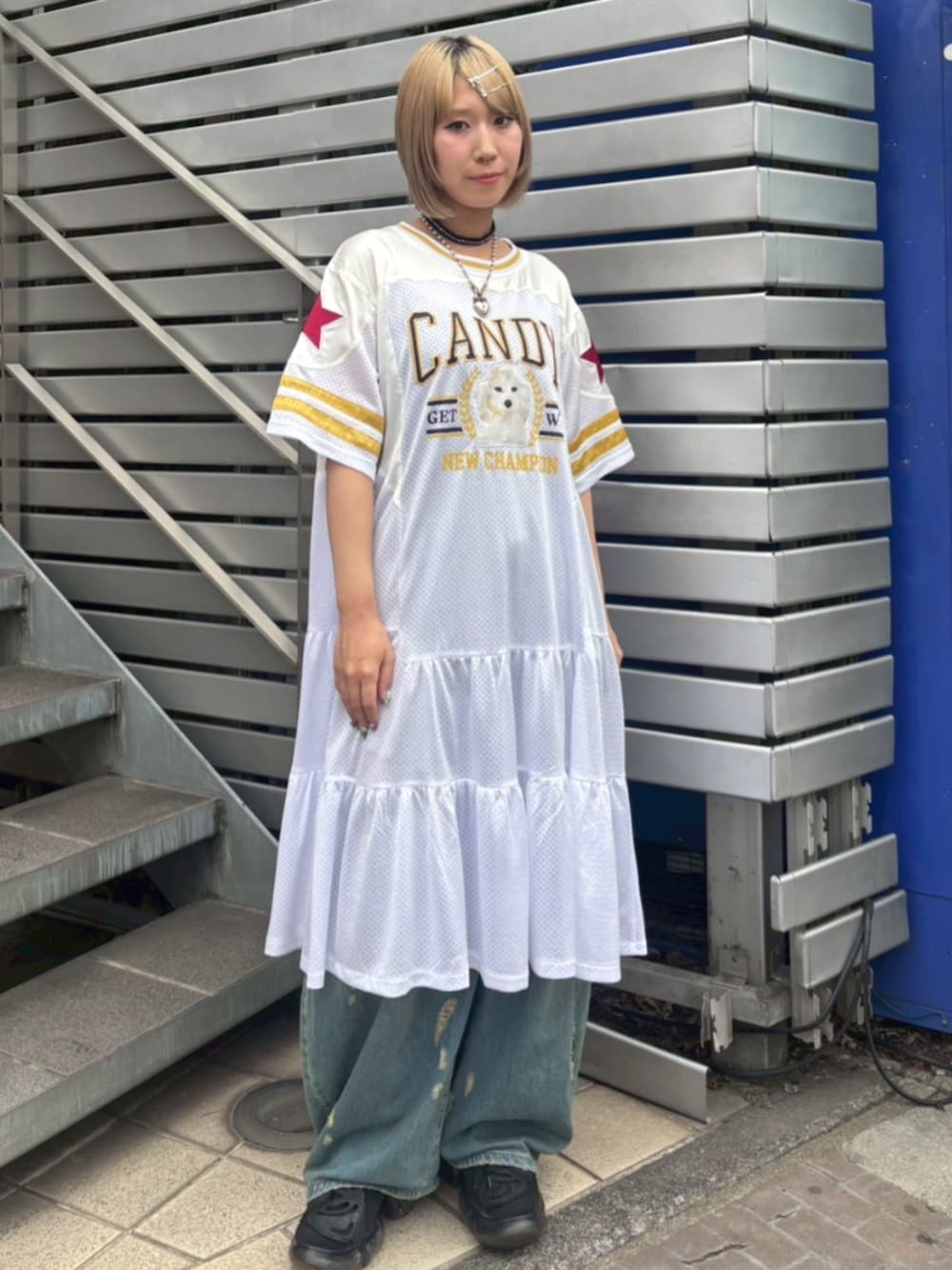 ゲームTシャツのディティールのスポーティなワンピースに トレンド感のあるバレルシルエットに仕上げたデニムパンツを合わせたカジュアルコーデ♪ Candy Stripper原宿本店/中西/160cm