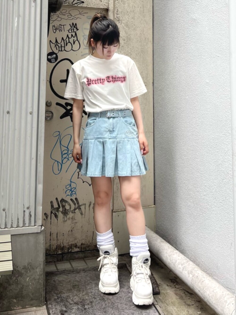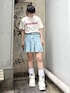 強めなガーリーロゴのTシャツにボックスプリーツのミニスカートを合わせたカジュアルガーリーコーデ◎ Candy Stripper仙台店/鈴木/160cm