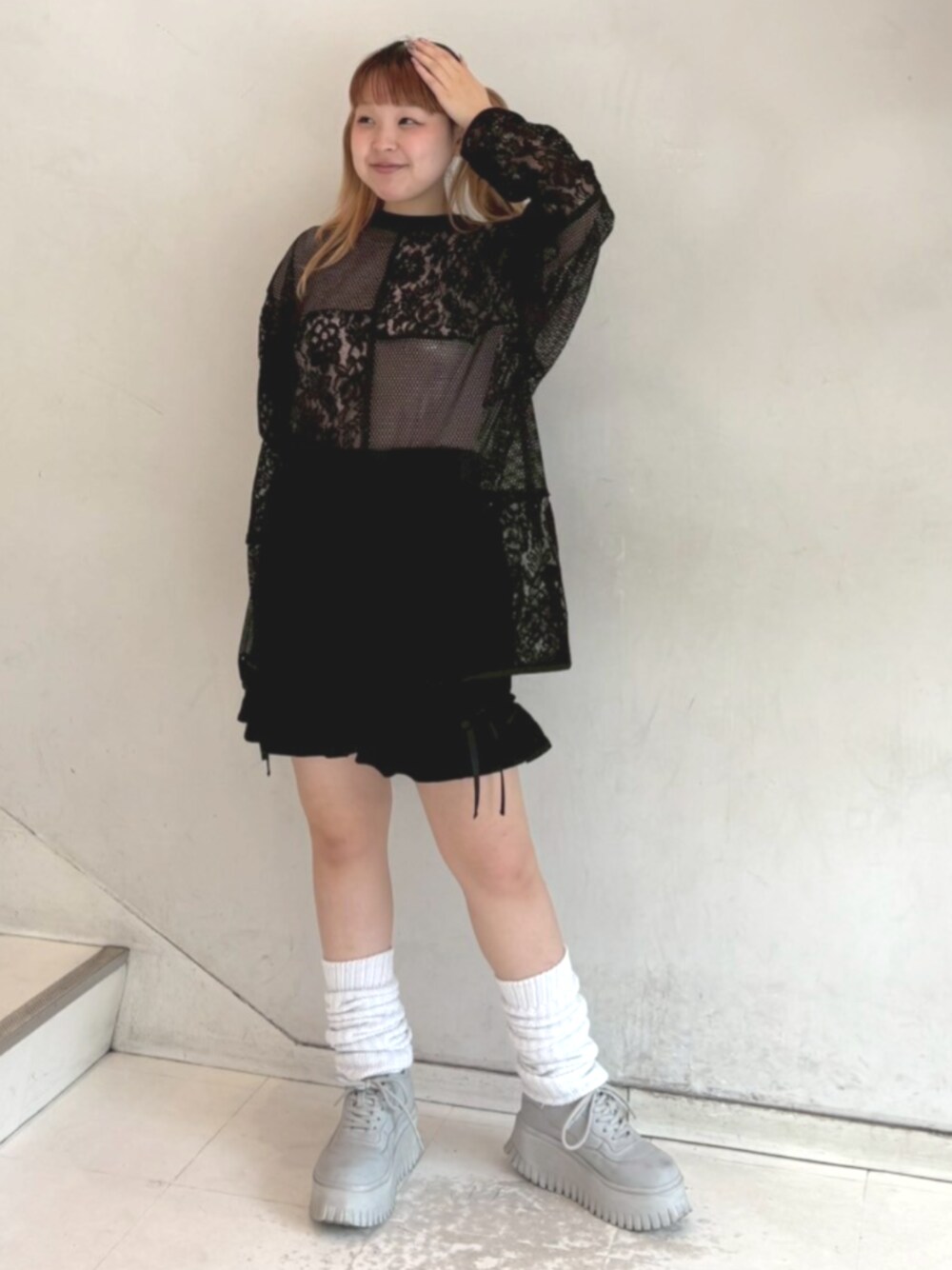 メッシュとレースを組み合わせたトップスにハート柄レースが可愛いショーツを合わせた大人カジュアルガーリーコーデ◎ Candy Stripper名古屋店/太田/156cm