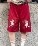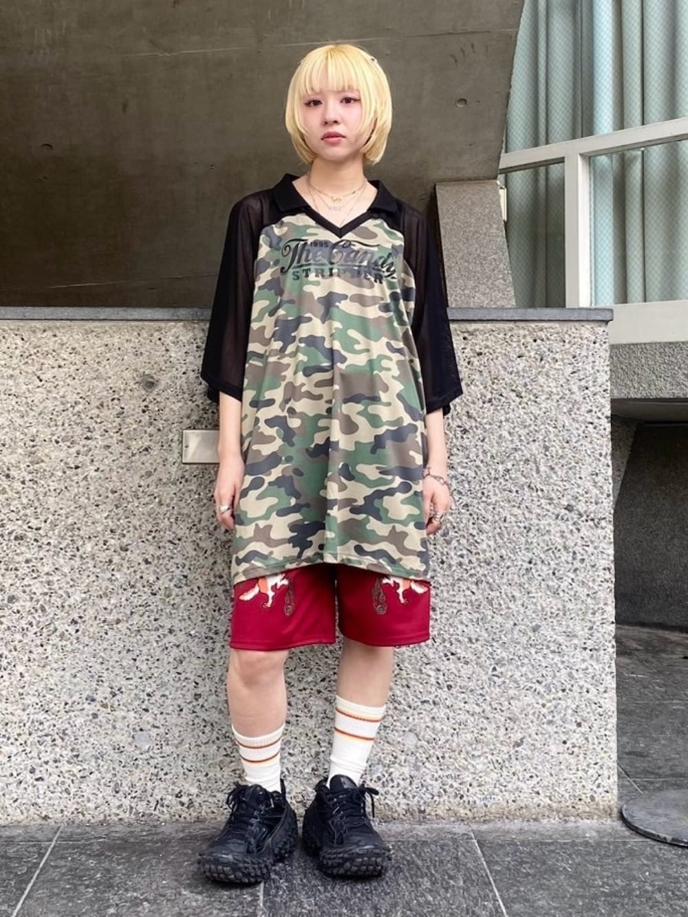 迷彩柄とメッシュを組み合わせたゲームシャツに猫の妖怪モチーフが刺繍されたハーフパンツを合わせたスポーツミックスコーデ★ Candy Stripper原宿店/久慈/148cm