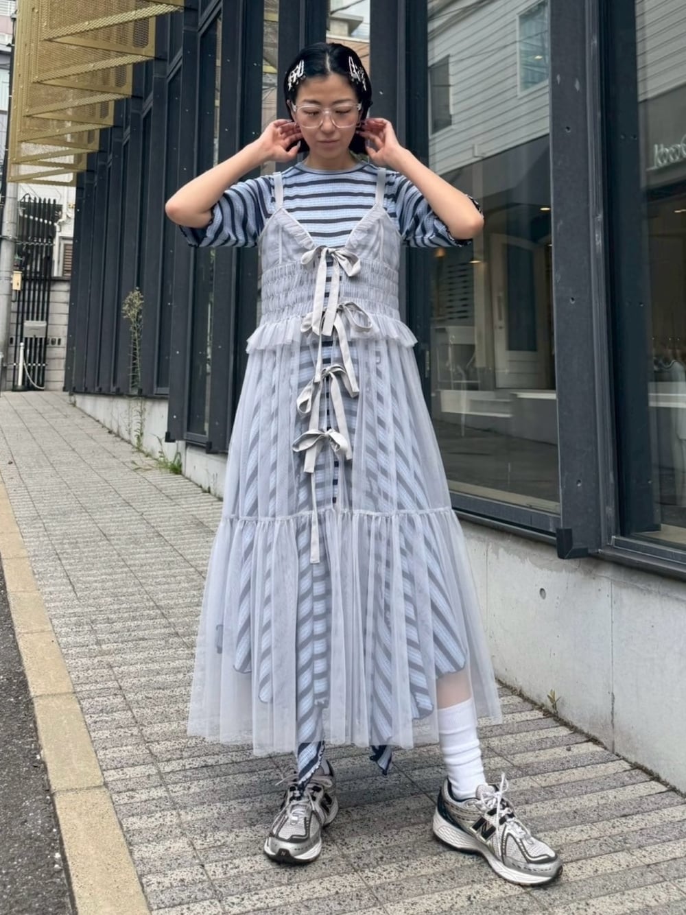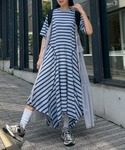 ボーダーテレコを使用したカットワンピースに ビスチェ風のキャミティアードワンピースを合わせたスポーツミックスコーデ♡ Candy Stripper本社/小原/162cm