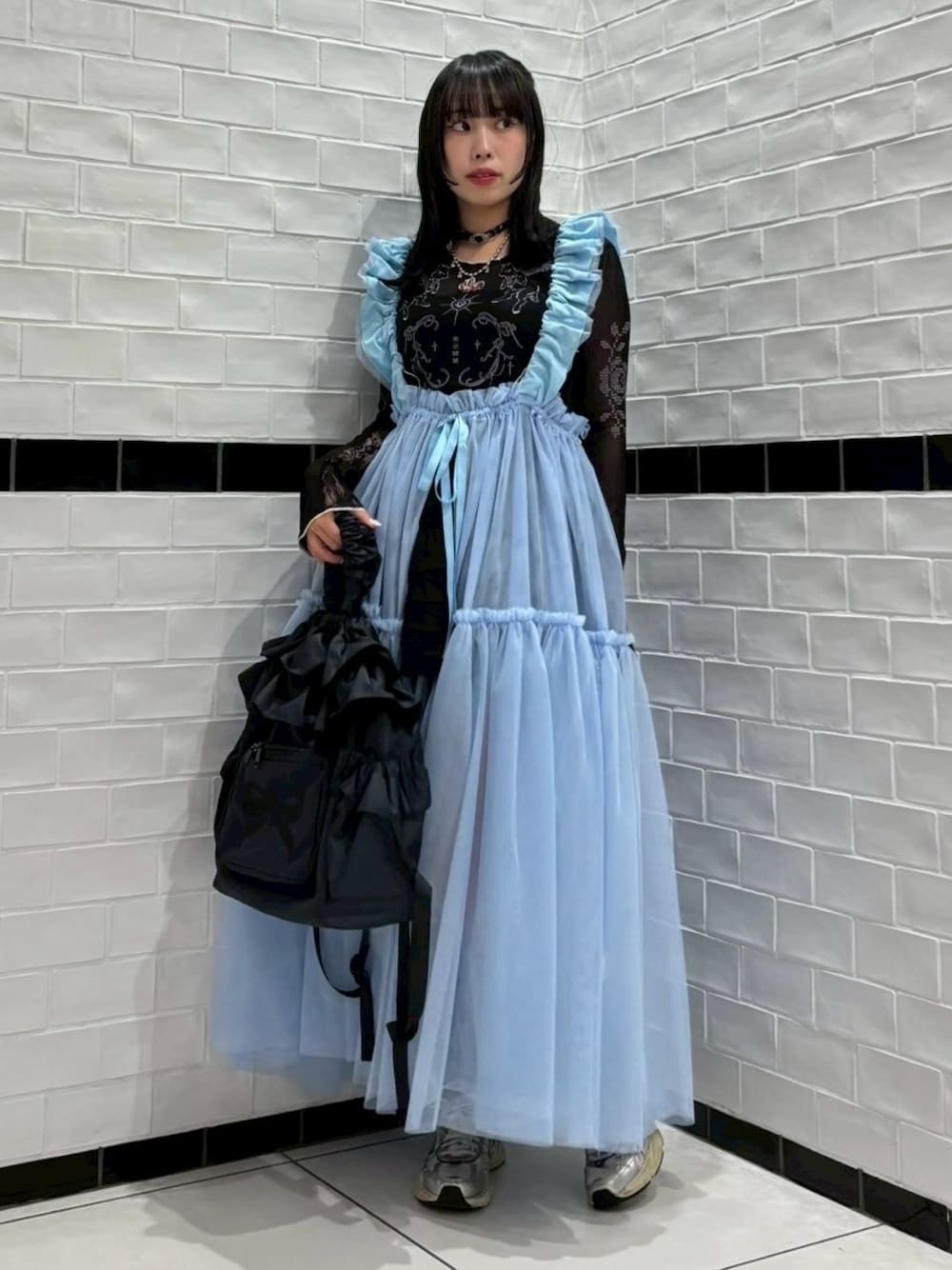 タトゥー風イラストのシアートップスに ハーネスチュールスカートとフリルスカートを合わせたデートコーデ♡ Candy Stripper福岡店/河野/160cm