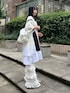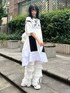 ユニフォームライクなリメイク風デザインのワンピースにフレアパンツと花柄のショルダーバッグを合わせたレイヤードスタイル♡ Candy Stripper福岡店/河野/160cm