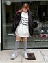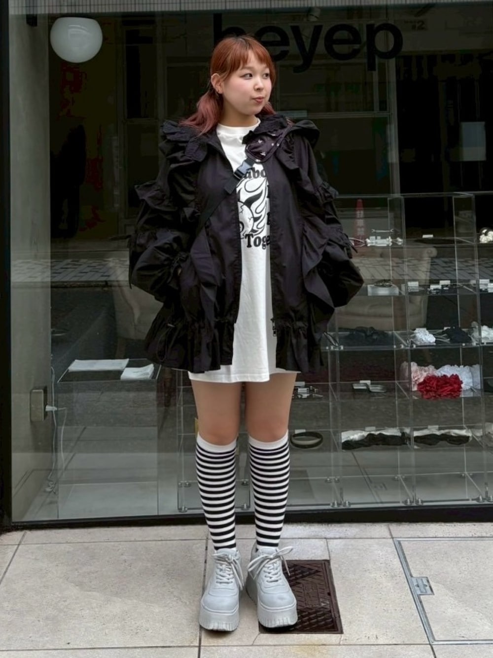 フード付きブルゾンにラグラントップスと 花柄のショルダーバッグを合わせた レイヤードスタイル★ Candy Stripper名古屋店/太田/156cm