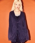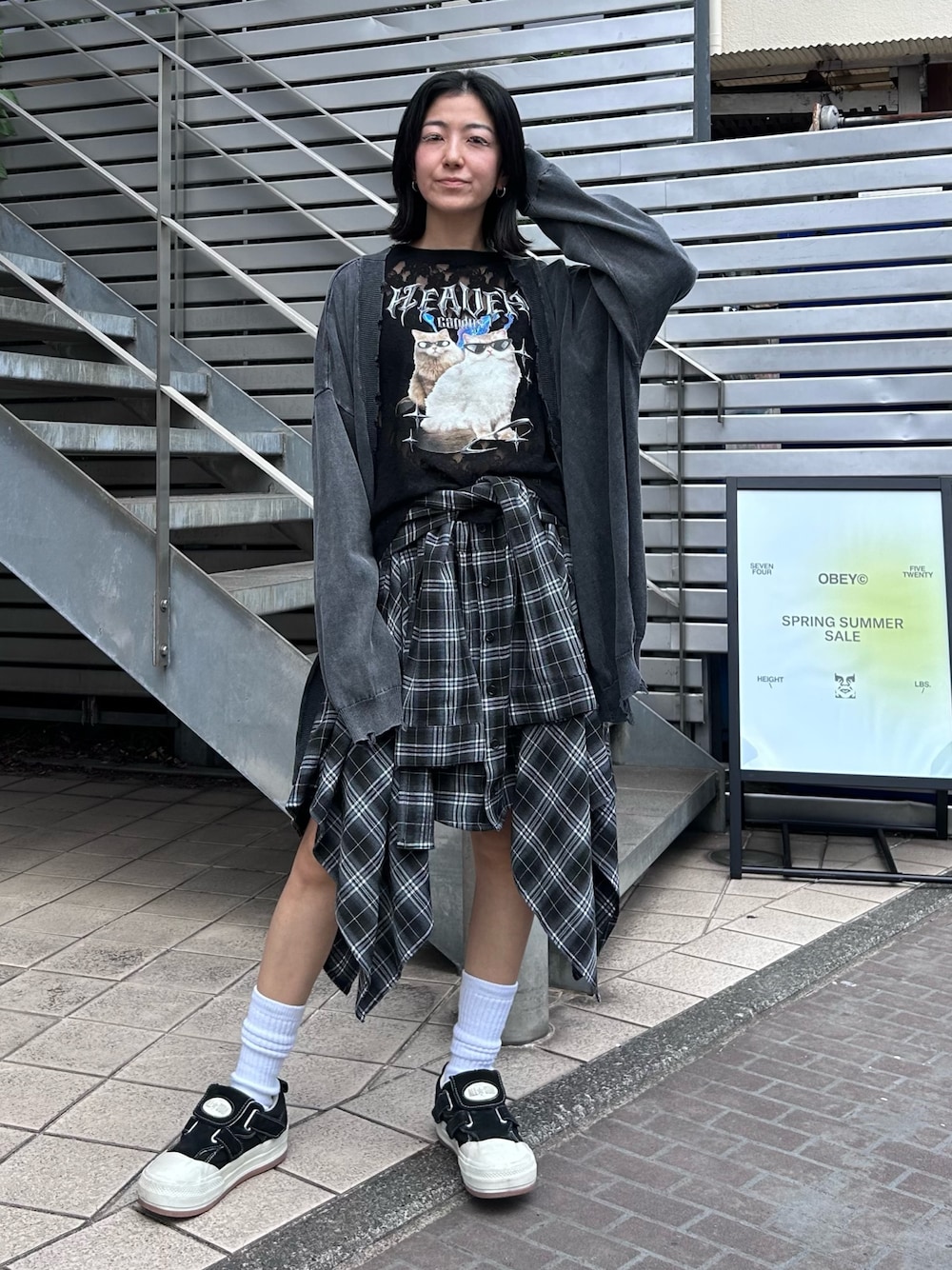 バンドT風のラグラントップスにカーディガンとチェック柄の巻きスカートを合わせた レイヤードスタイル★ Candy Stripper本社/小原/162cm