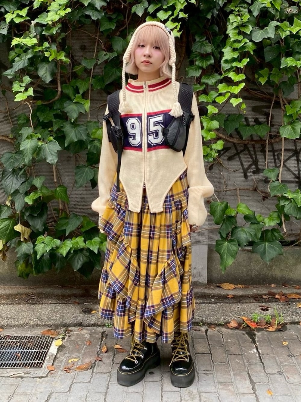 ボディスーツ型のジップブルゾンに チェックのティアードスカートを合わせた スポーツミックスコーデ★ Candy Stripper原宿店/久慈/148cm