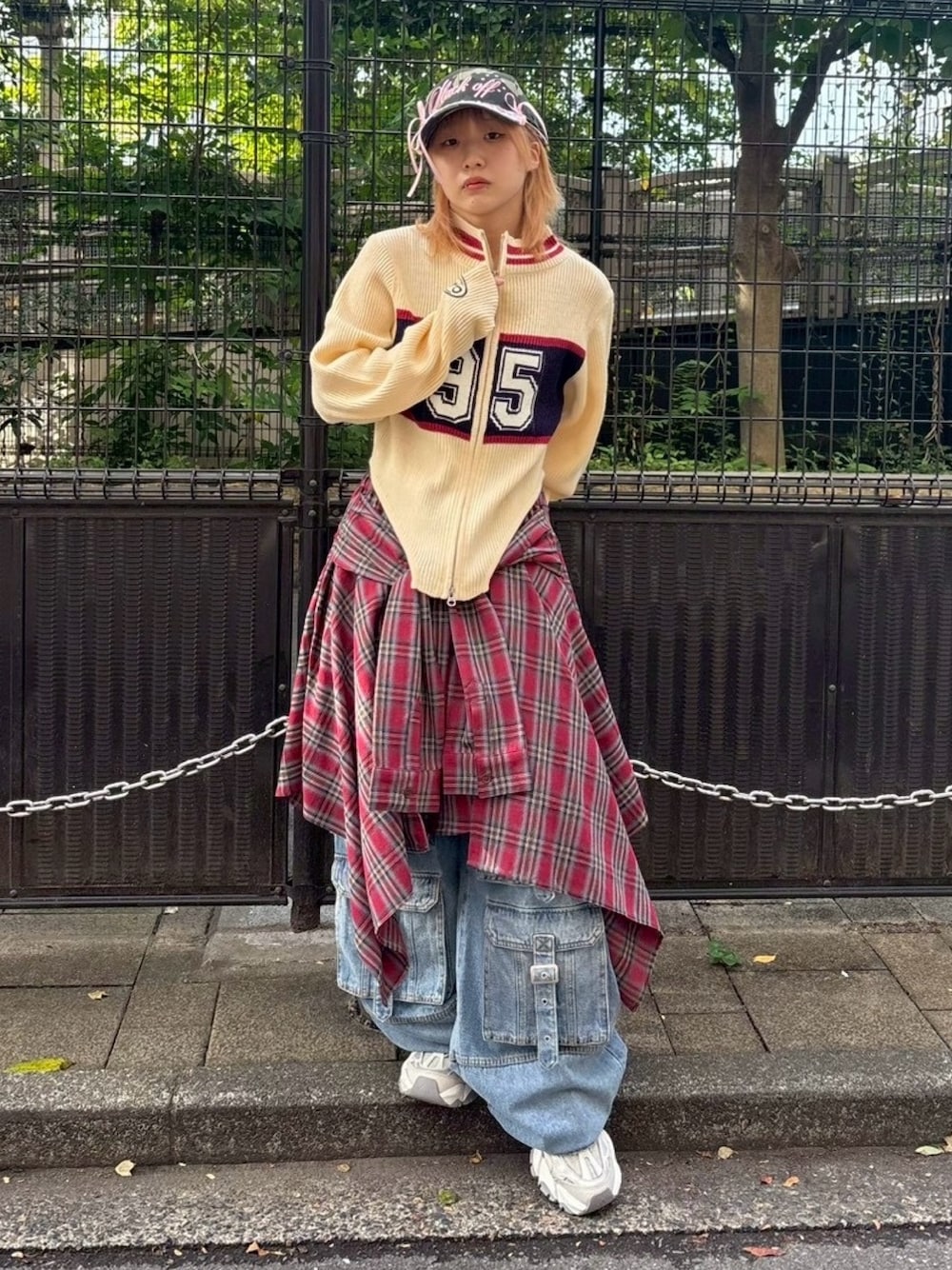ボディスーツ型のジップブルゾンに チェック柄の巻きスカートとデニムパンツを 合わせたスポーツミックスコーデ♪ Candy Stripper池袋店/小川/154cm